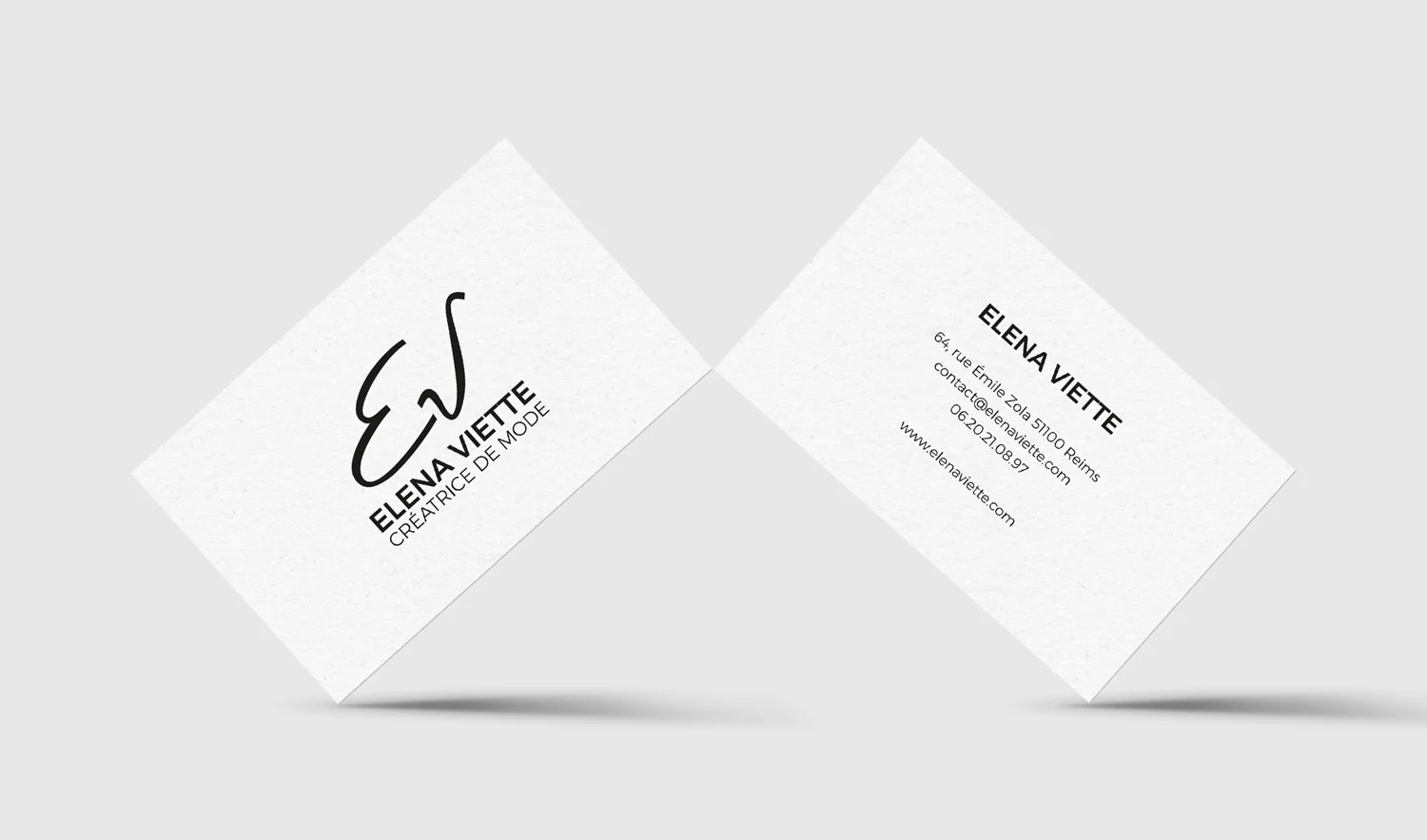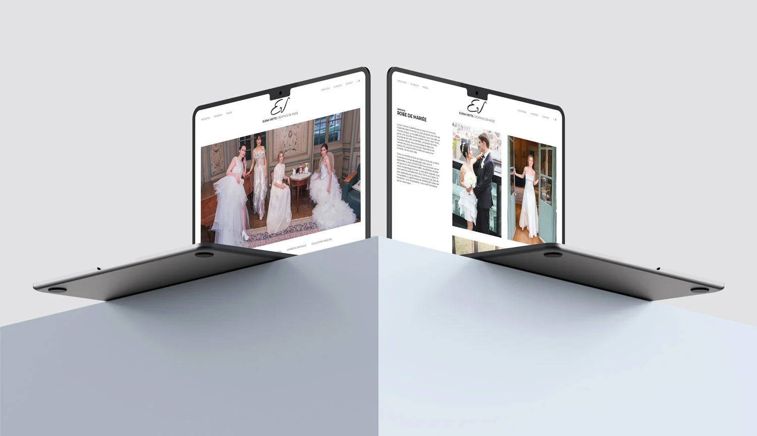 Elena est une créatrice de mode réalisant à la fois des robes de mariée et des tenues sur-mesure, mais également des créations plus originales mêlant récup et artisanat. Prenant part à de nombreux défilés et salons, il était important pour la marque d’avoir une identité solide, je l’ai donc retravaillée. La calligraphie du monogramme affirme le côté fait main pour représenter aux mieux les valeurs de la créatrice, le site et autres supports de communication, eux, sont sobres et épurés de manière à parler à tout un chacun et faire davantage résonner les créations.