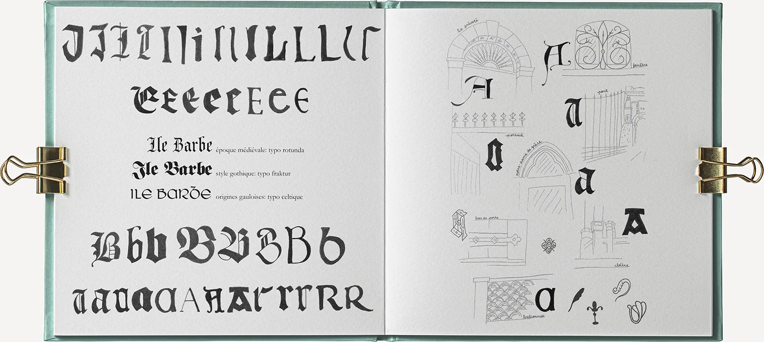 L’Île Barbe n’est que très peu connue et témoigne pourtant d’un passé riche et mouvementé d’une parcelle de Lyon s’étalant sur tout le long du Moyen-âge. J’ai ainsi voulu la mettre en avant sous la forme d’une typographie corrélant différents styles qui rappelleraient les origines gothiques et médiévales de ce lieu.